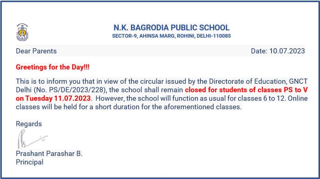 Holiday(Classes PS-V) Due to Orange Alert Issued by Indian Metrological Department (11.07.2023)