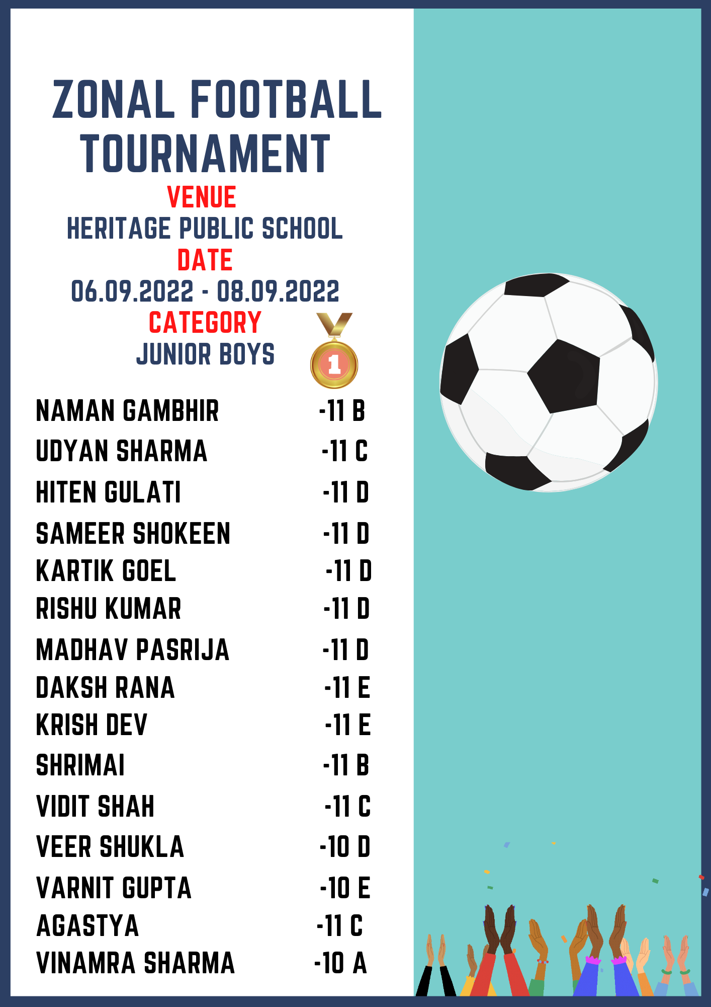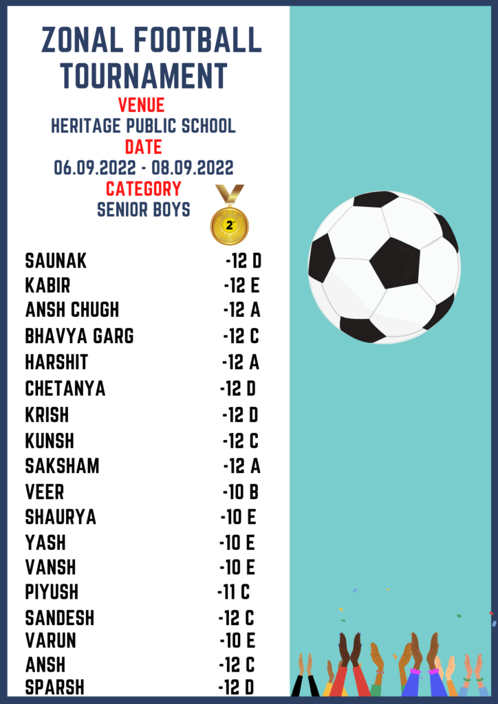 | ZONAL FOOTBALL CHAMPIONSHIP | SENIOR BOYS | SACHDEVA PUBLIC SCHOOL | LAKSHIT- 9B PARAS- 7B NAMAN- 8B TEJAS- 7B ABHISHEK- 9B BHAVYA- 8D KRISHIV- 8B RAJ- 8D ARYAVEER-8B TANISHK-7D RAO ADITYA – 9B ATHRAV- 8B SAMARTH- 8A KAVISH- 8B UJJWAL- 8B | I POSITION |
