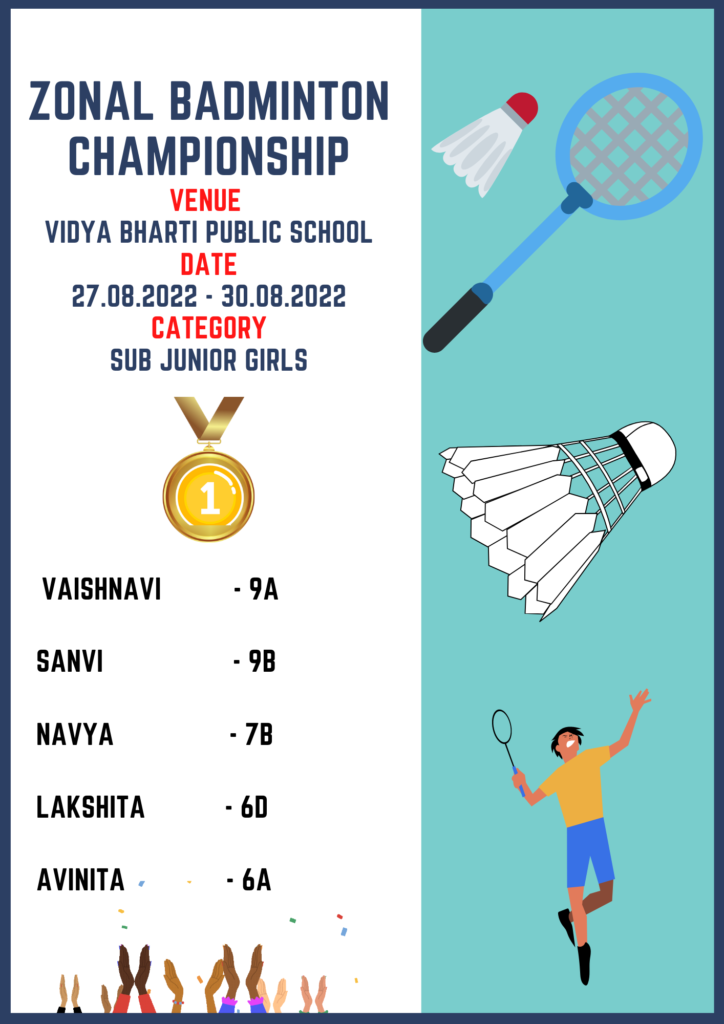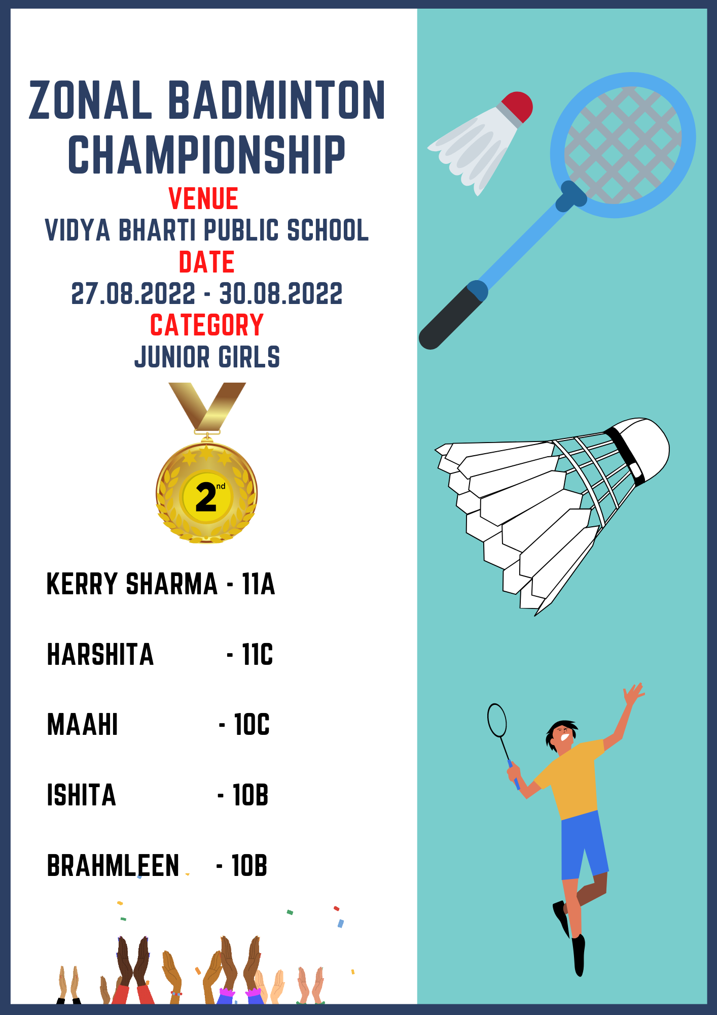 | BADMINTON TOURNAMENT | JUNIOR GIRLS | GLORIOUS PUBLIC SCHOOL, ROHINI | SANVI SHARMA- 11B VAISHNAVI – 11E AMRIT – 11E NAVYA- 9E PARI – 9A | II POSITION |
