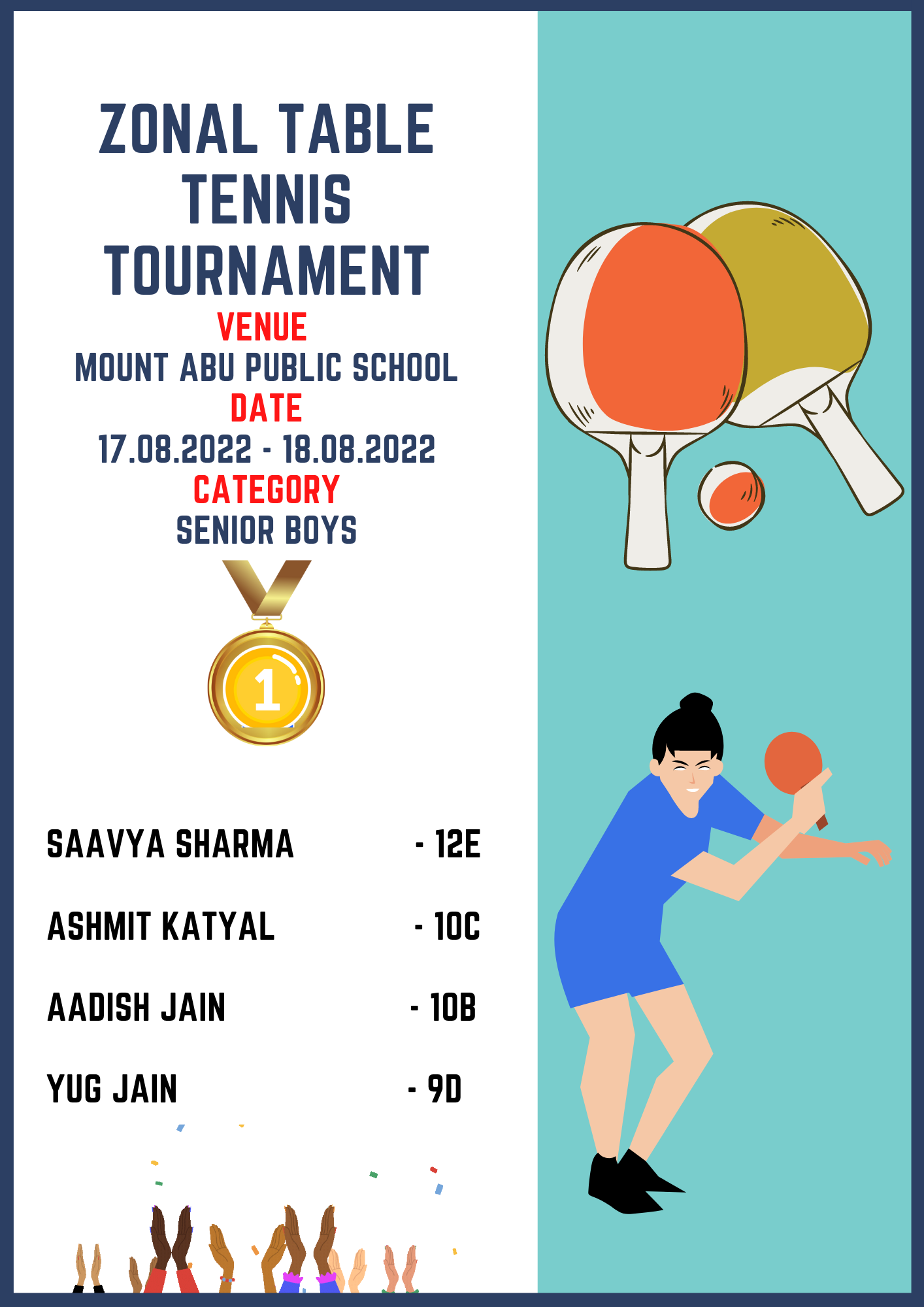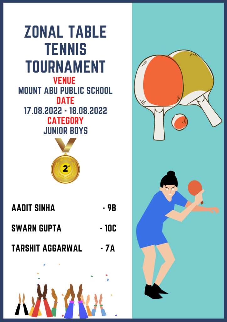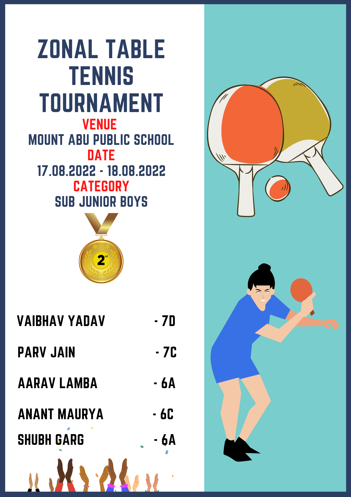 | TABLE TENNIS COMPETITION | JUNIOR BOYS TEAM SENIOR BOYS TEAM SUB JUNIOR BOYS | MOUNT ABU PUBLIC SCHOOL, ROHINI | ——- ——– ———- | I POSITION II POSITION II POSITION |