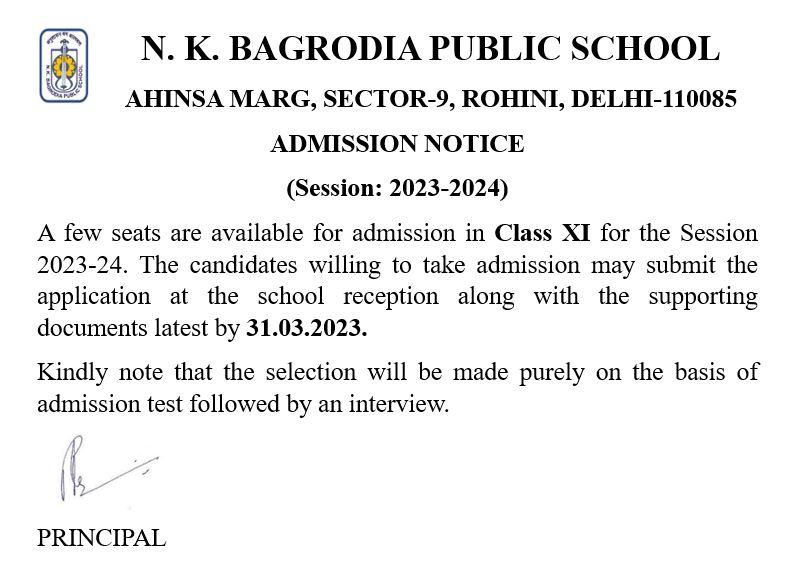Vacant Seats for Admission in Class XI (2023- 2024)